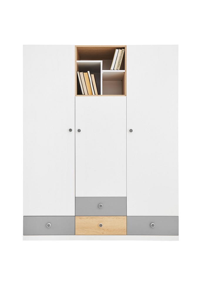 Riidekapil on 3 ust, 4 sahtlit ja avatud riiul kapi ülaosas.