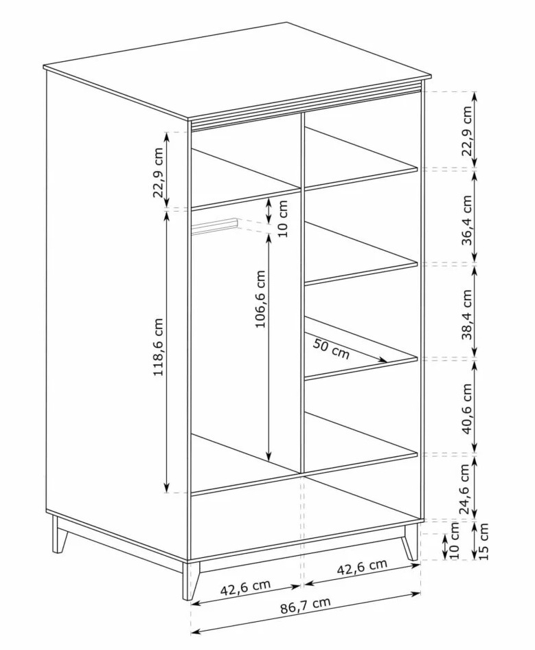 Riidekapil on 2 ust ja 1 sahtel. Uste taga on riidepuutoru ja pesuriiulid.