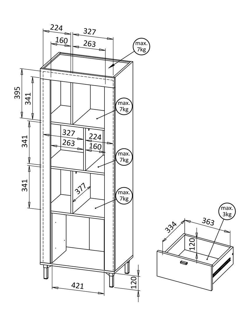 Avatud riiulil 2 sahtliga.