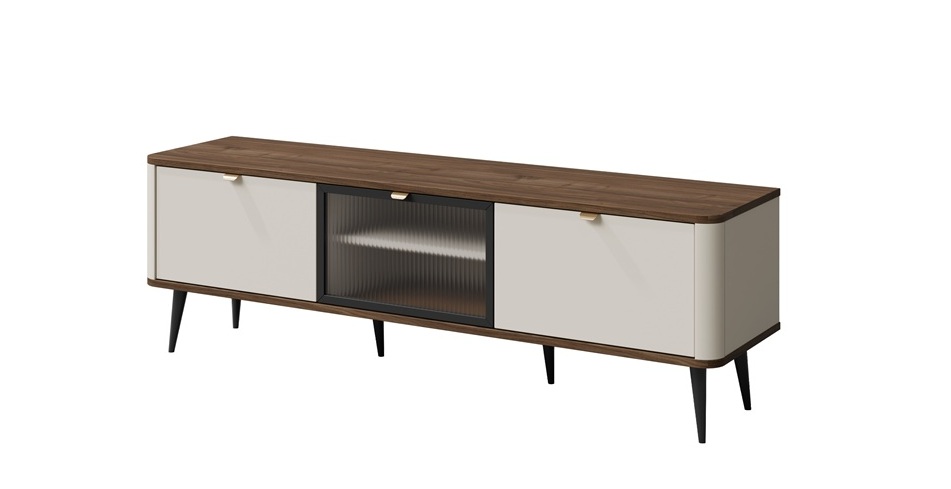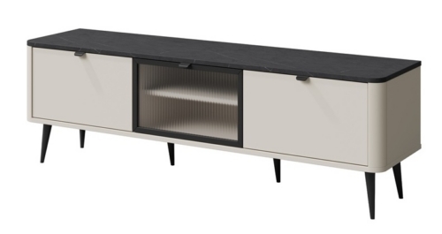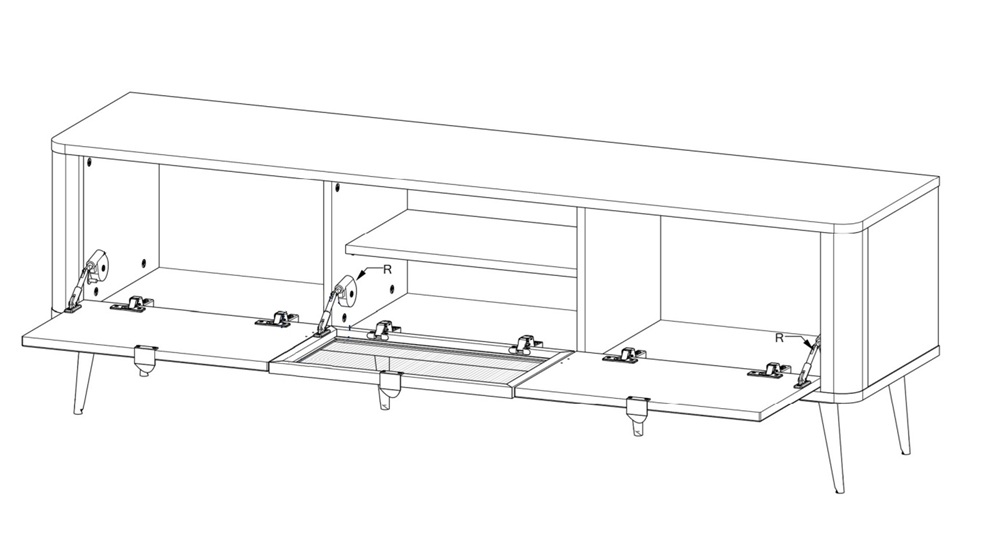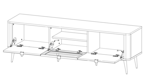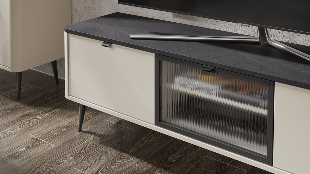 Televiisorialusel on 3 ette avanevat ust. Keskmine uks on musta värvi alumiiniumraamiga karastatud klaasist.