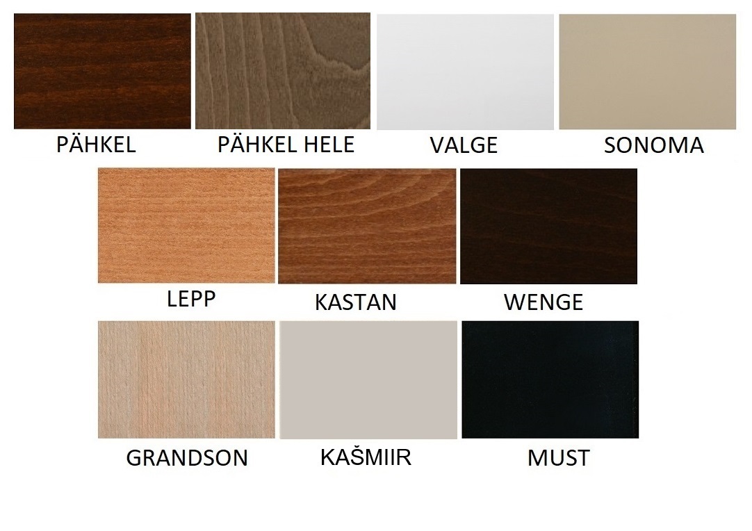 Puidu värvid: pähkel; pähkel hele; valge; sonoma; lepp; kastan; wenge; grandson; kašmiir; must.