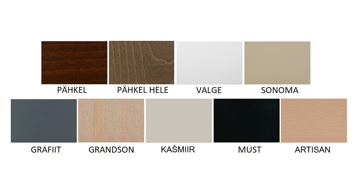 Puidu värvid: pähkel; pähkel hele; valge; sonoma; grafiit; grandson; kašmiir; must; artisan.