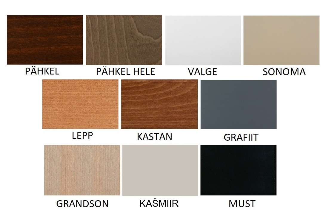 Värvivalik: pähkel; pähkel hele; valge; sonoma; lepp; kastan; grafiit; grandson; kasšmiir; must.