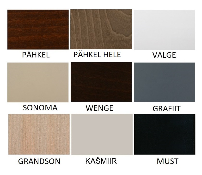 Puidu värvid: pähkel; pähkel hele; valge; sonoma; wenge; grafiit; grandson; kašmiir; must.