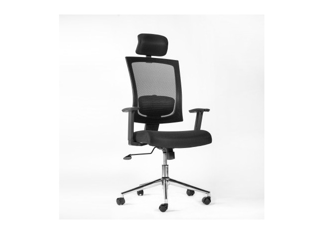 Kontoritool on kaetud musta võrkkangaga.