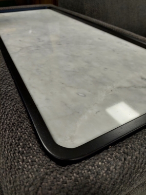 Komplekti täiustavad silmapaistvad puitelemendid ja heleda marmori värvi lauaplaat.