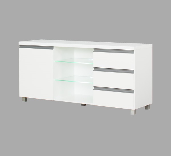 Tv-alusel on 1 uks, 3 sahtlit ja tugevast klaasist 2 avatud riiulit.
