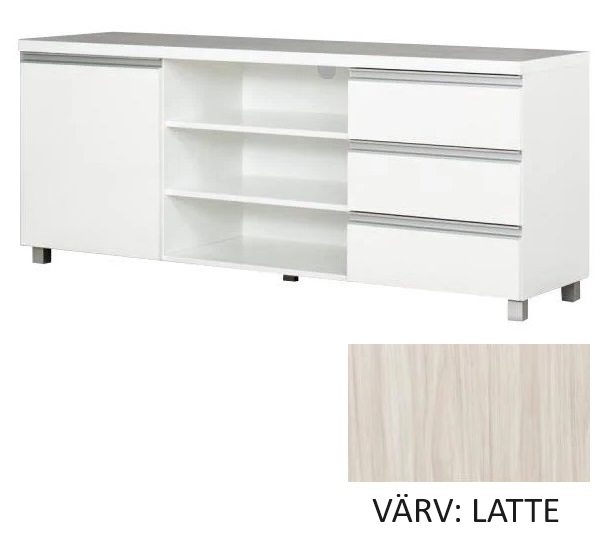 Tv-alusel on 1 uks, 3 sahtlit ja avatud riiuliosa.
