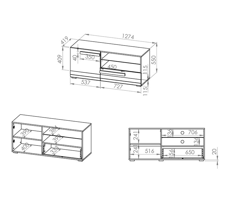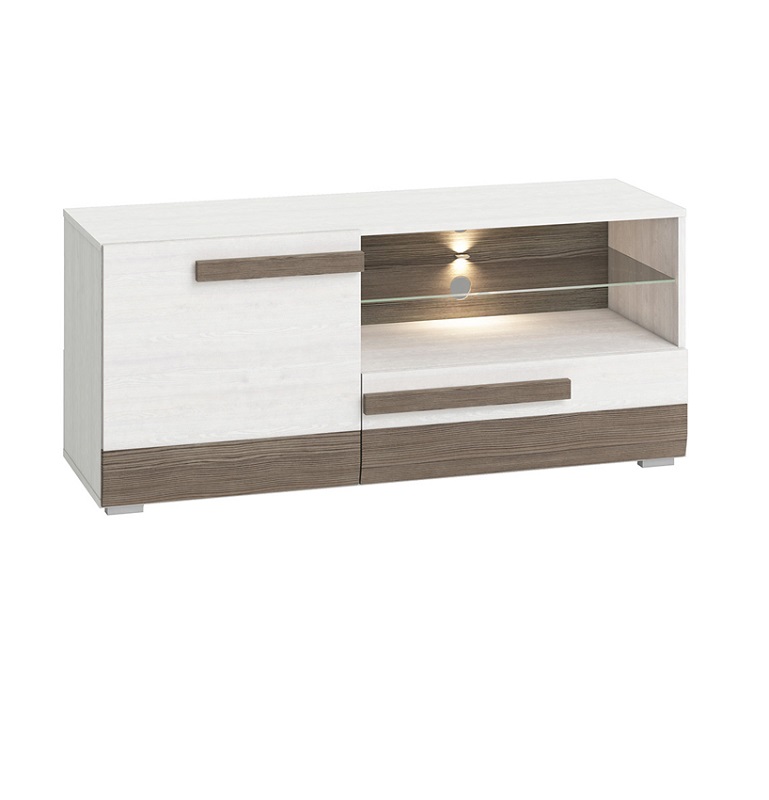 Tv-alusel on 1 uks, 1 sahtel ja avatud riiul. Riiul on tugevast karastatud klaasist.