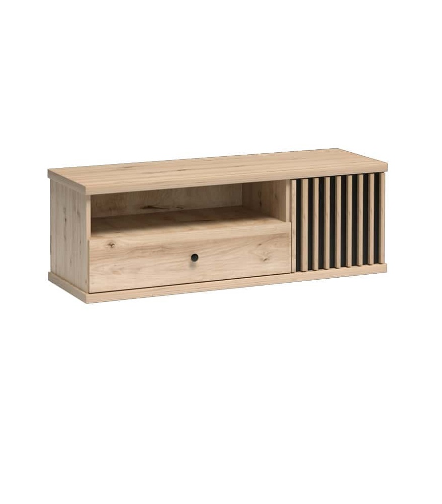 Tv-alus on tamm artisani värviga, uks on musta värvi mööbliplaadist + lisaks MDF liistud värviga – tamm artisan.