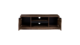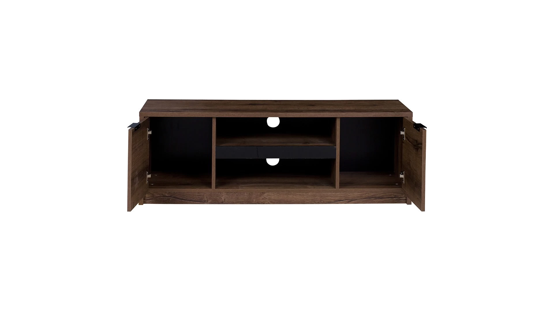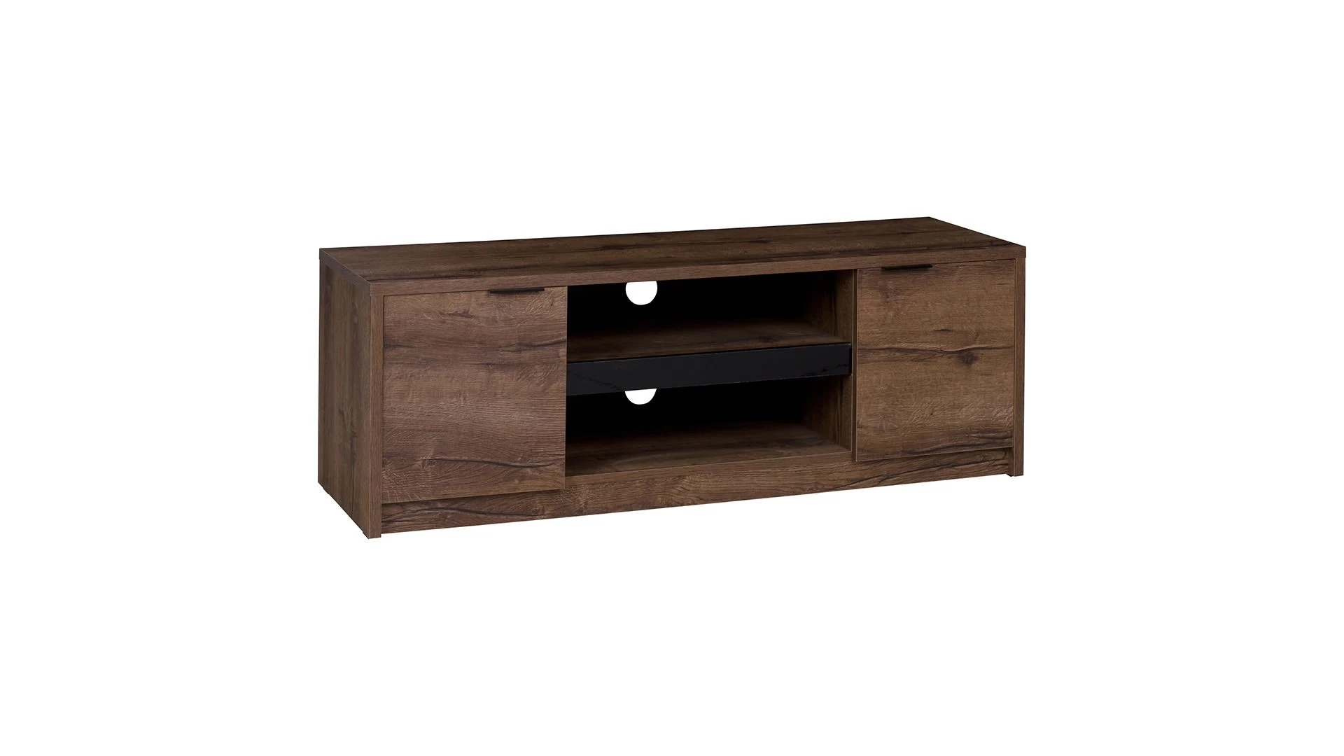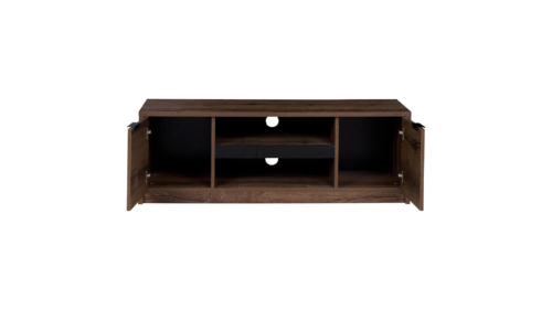 Tv-alusel on keskel avatud riiulid seadmetele ja külgedel suletud kapid.