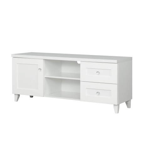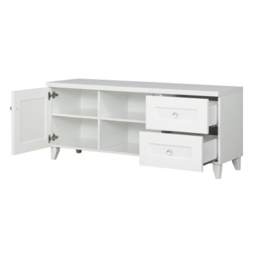Tv-alusel on 1 uks, 2 sahtlit ja avatud riiul.