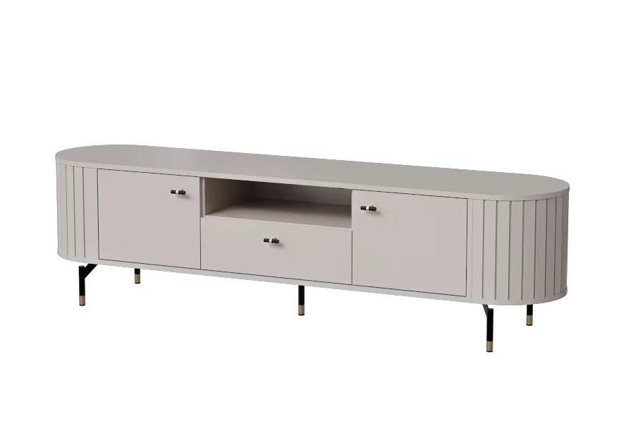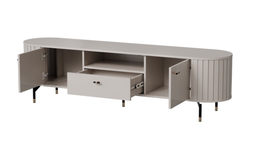 Tv-alusel on kõrged metallist jalad (mustad, kuldsete detailidega) ja metallist minimalistlikud käepidemed (mustad, kuldsete detailidega).