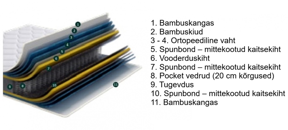 Madratsi kattekangas on hüpoallergeenne, mis tagatakse bambuskiudude lisamisega selle koostisesse. Samuti on madratsi üks kiht valmistatud bambuskiududest, mis on ökoloogiliselt puhas materjal ega tekita allergilisi reaktsioone. Seetõttu sobib see tundliku nahaga inimestele. Bambuskiududele on iseloomulik ka antibakteriaalne toime ja hea õhu läbilaskvus, mis aitab niiskust imada ja materjalist eemaldada. Bambustooraine kasvatamisel ei kasutata keemilisi lisandeid. Bambus on tuntud oma looduslike antibakteriaalsete omaduste poolest. Ligikaudu 90% bambuskiule sattunud bakteritest sureb 24 tunni jooksul.