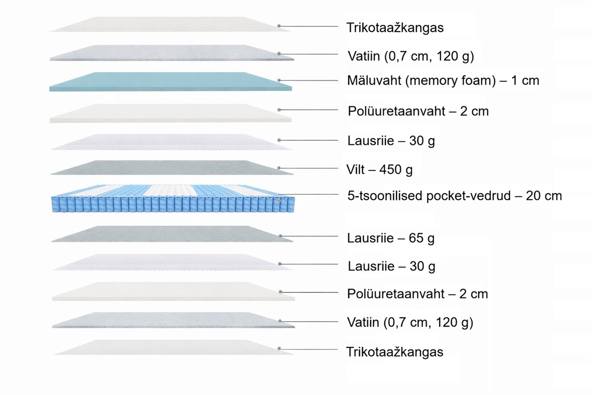 Madratsil on 20 cm kõrgune 5-tsooniline pocket vedrusüsteem, kus iga vedru on pakitud eraldi kotikesse.