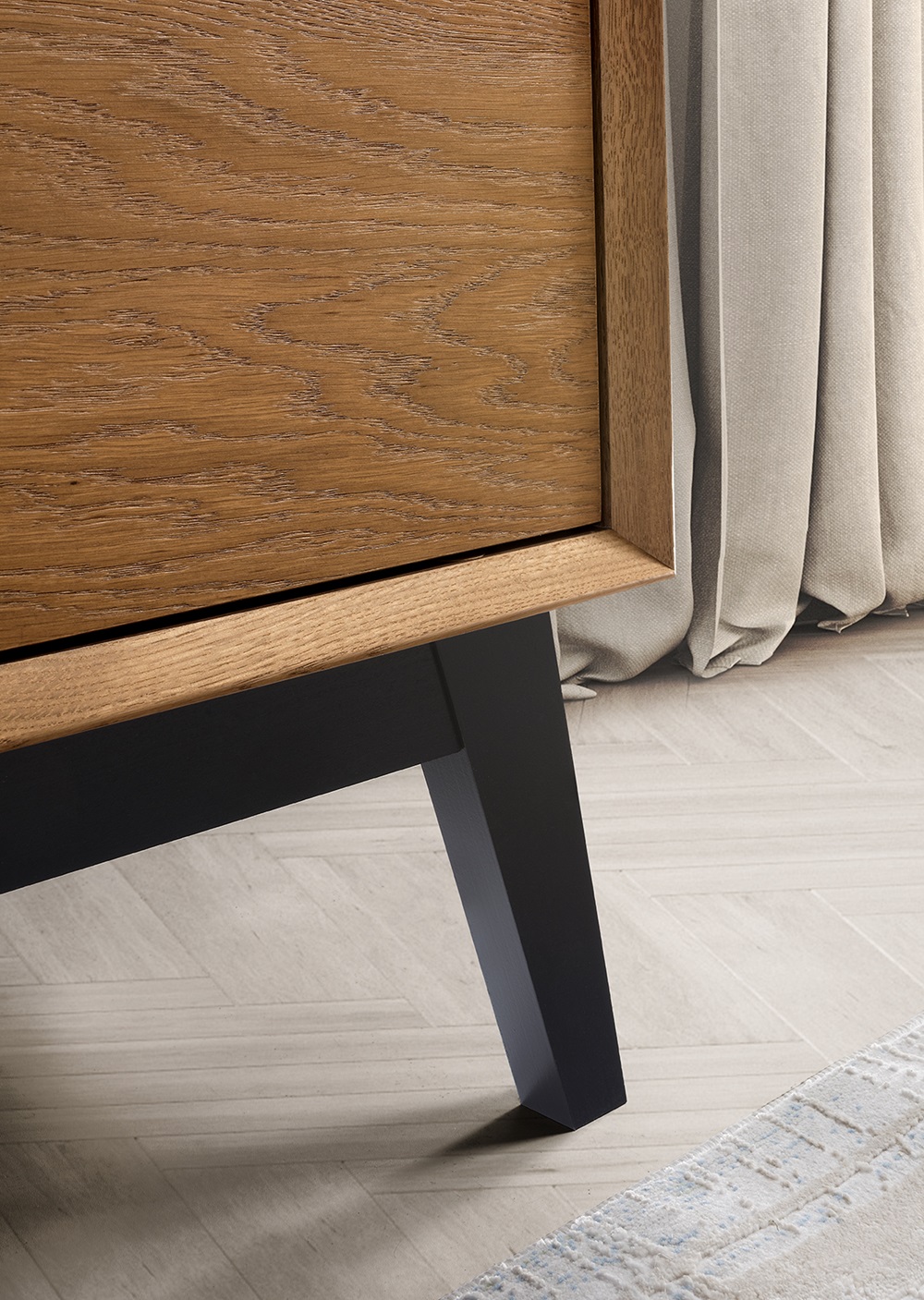Korpus: väljas mööbliplaat naturaalses tammespoonis; sees lamineeritud mööbliplaat, freesitud täispuidust serv.