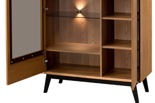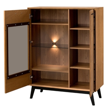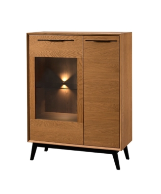 Korpus: väljas mööbliplaat naturaalses tammespoonis; sees lamineeritud mööbliplaat, freesitud täispuidust serv.
