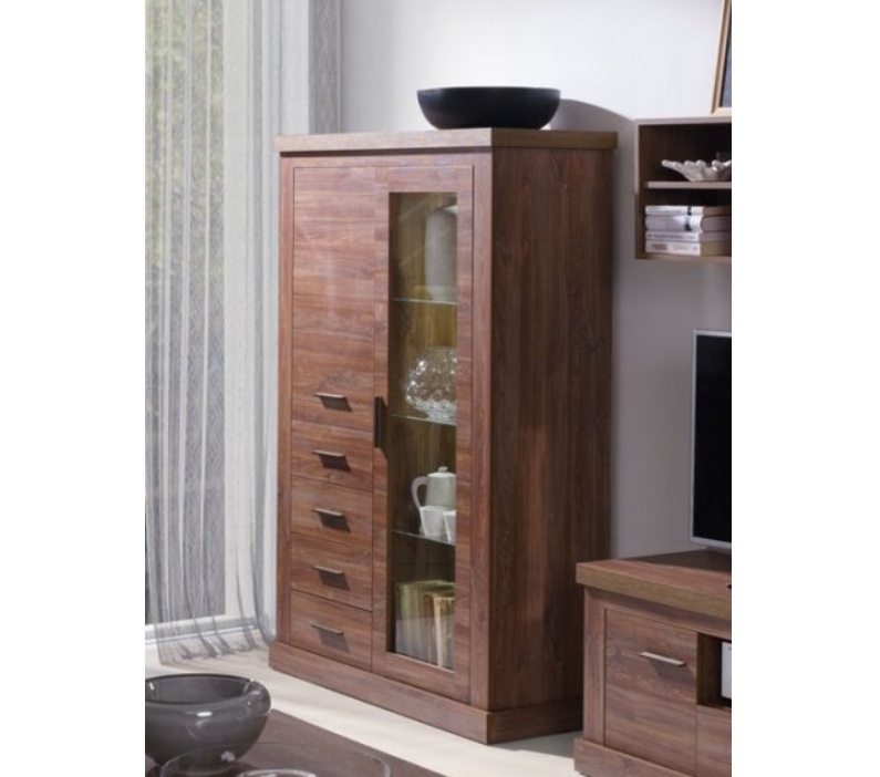 Vitriinkapil on 2 ust ja 4 sahtlit. Suurem uks on osaliselt klaasiga ja selle taga on klaasist riiulid.