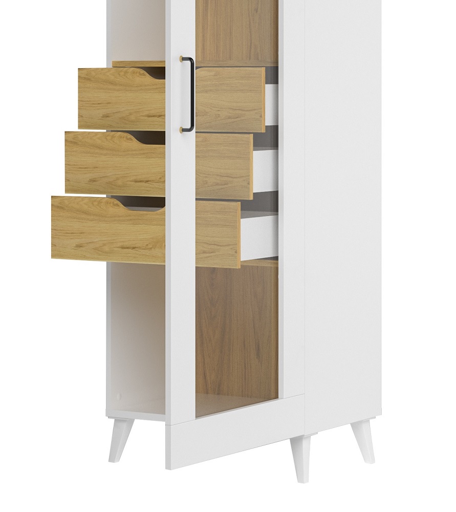 Ukse taga on tugevast klaasist riiulid ja 3 sahtlit.