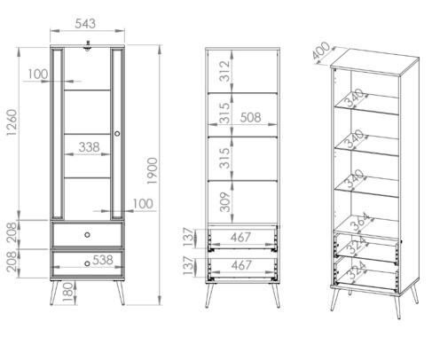 Vitriinkapil on 1 osaliselt klaasiga uks ja 2 sahtlit.