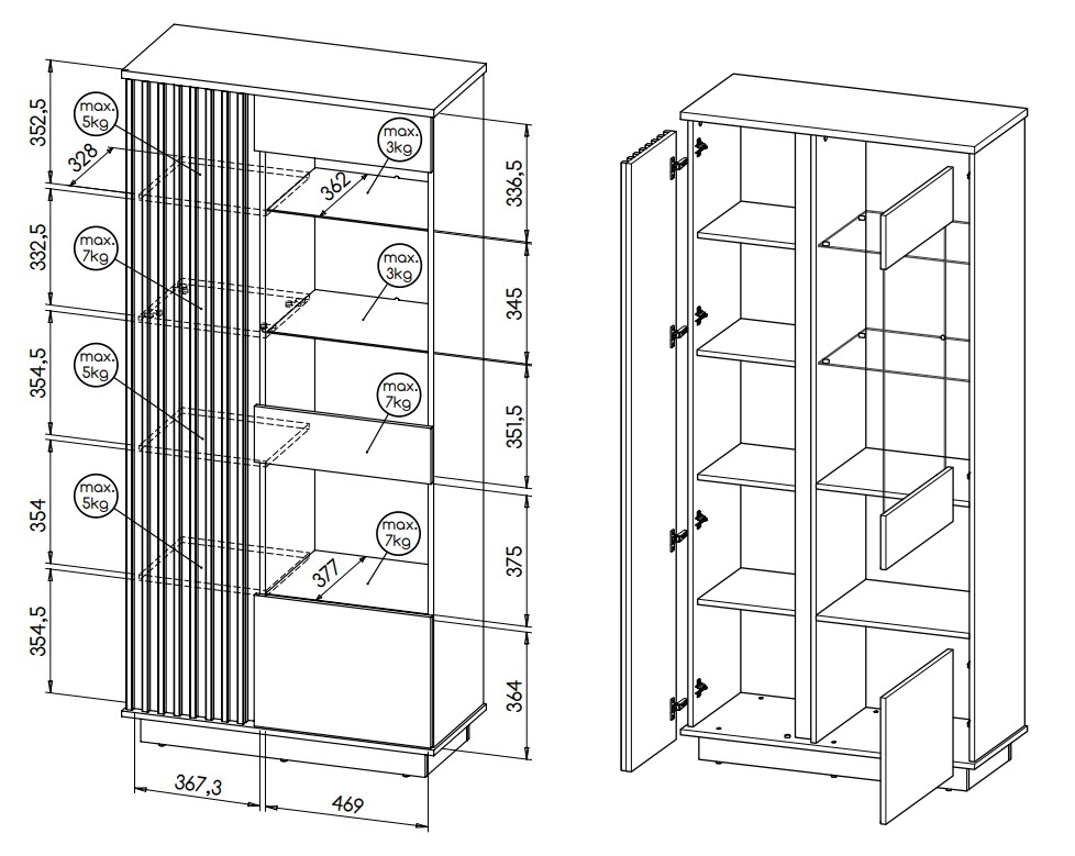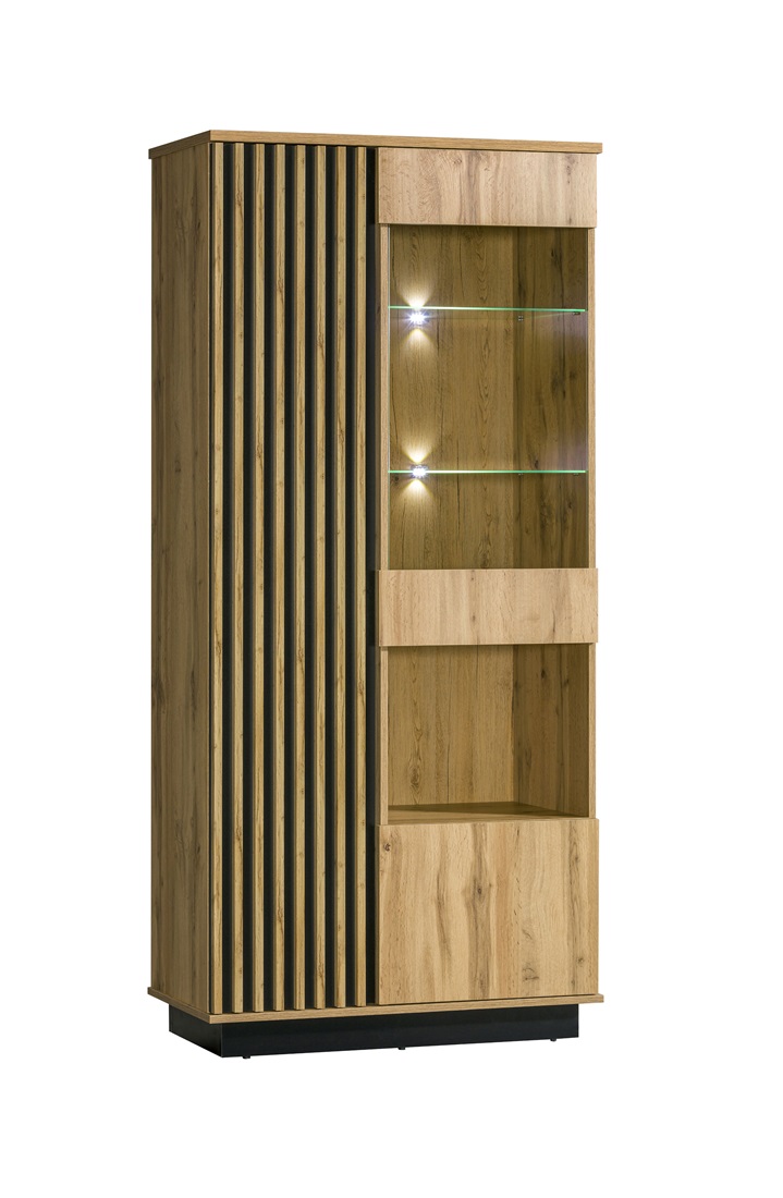 Vitriinkapil on 1 lamellidega kaetud pikk uks, 1 osaliselt klaasiga uks ja 1 väike uks kapi alumises osas. Klaasiga ukse taga on tugevast karastatud klaasist riiulid.