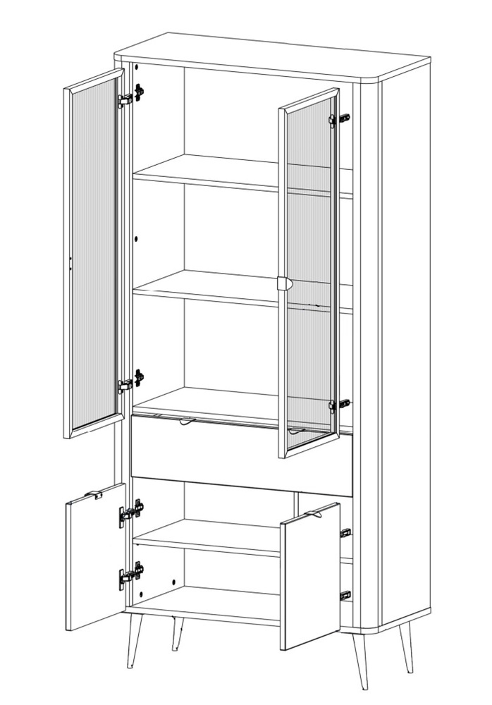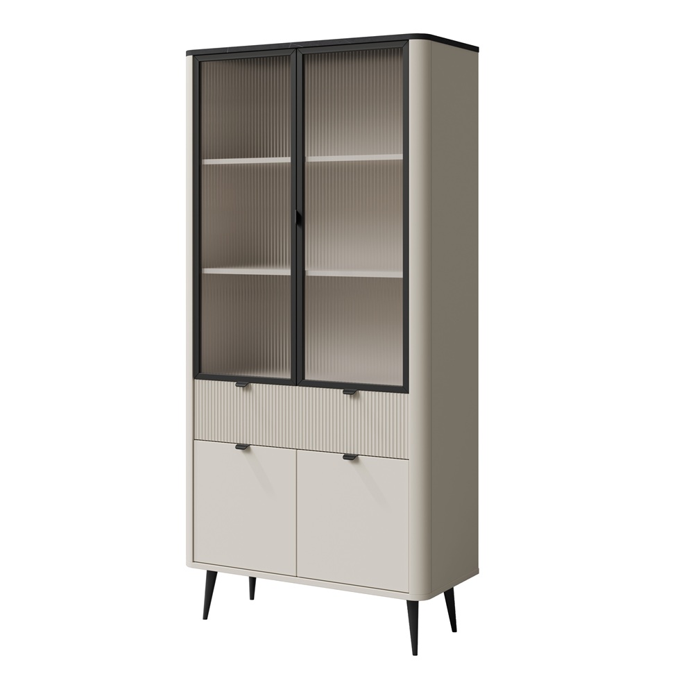 Vitriinkapil on 4 ust ja 1 sahtel. Ülemised uksed on musta värvi alumiiniumraamiga karastatud klaasist.
