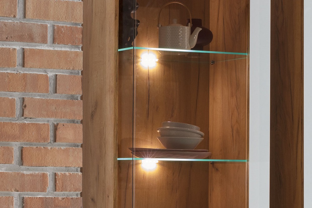 1 uks on osaliselt klaasiga. Klaasiga ukse taga on klaasist riiulid.