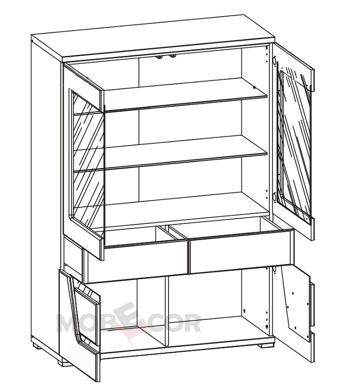 Vitriinkapil on 2 klaasiga ust, 2 tavalist ust ja 2 sahtlit.