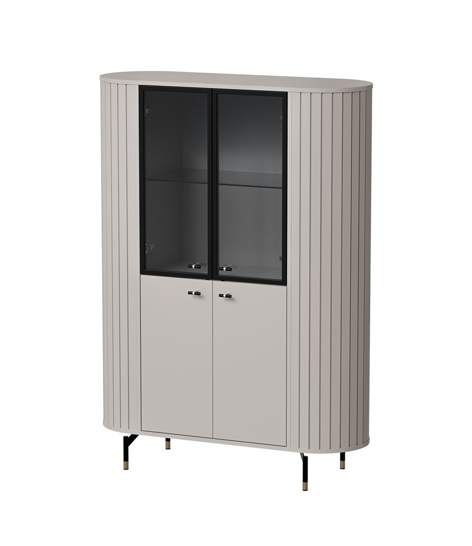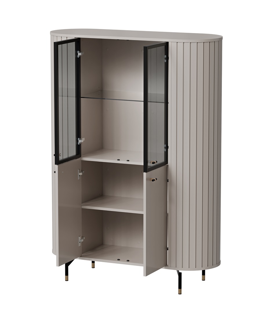 Vitriinkapil on kõrged metallist jalad (mustad, kuldsete detailidega) ja metallist minimalistlikud käepidemed (mustad, kuldsete detailidega).
