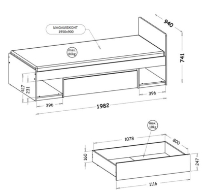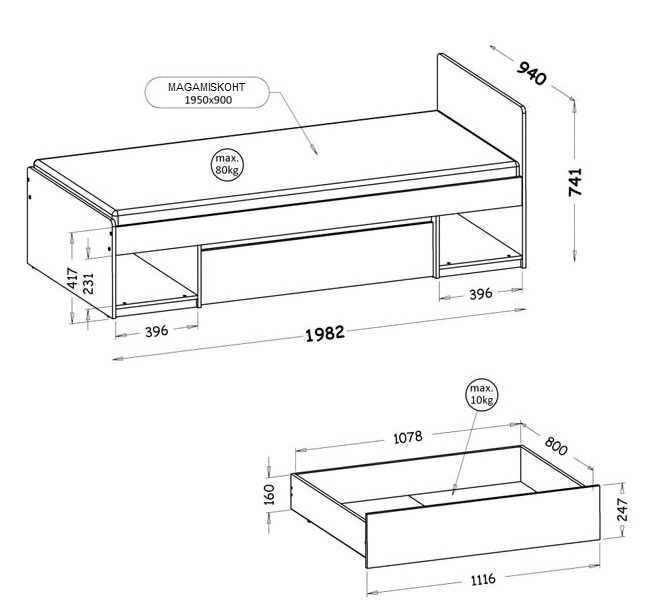 Voodile sobib madrats mõõtudes 90 x 195 cm.