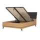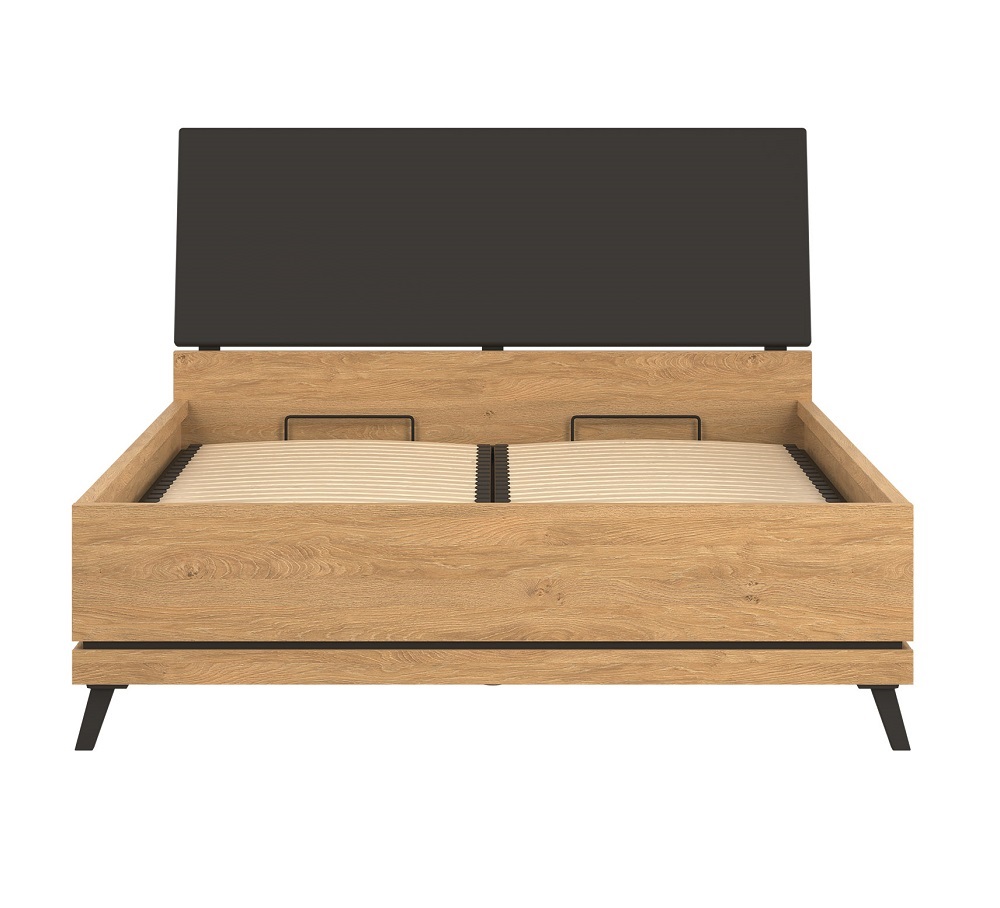 Voodil on mehhanismiga ülestõstetav voodipõhi ja selle all mahukas pesukast.
