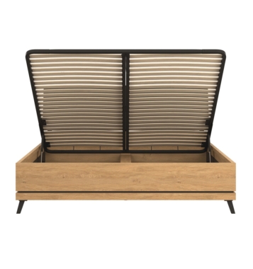 Voodil on mehhanismiga ülestõstetav voodipõhi ja selle all mahukas pesukast.