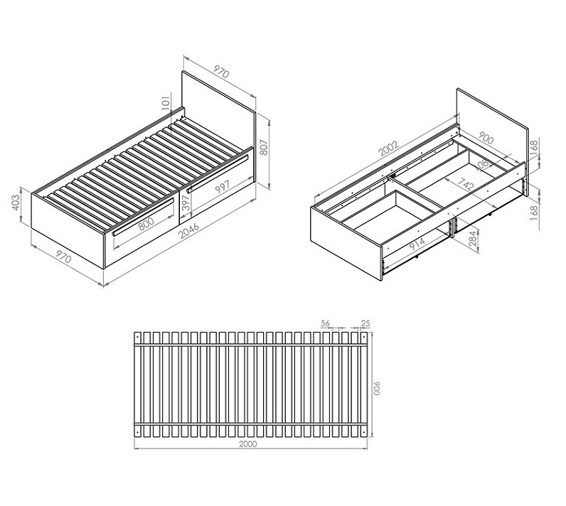 Komplekti kuulub voodikarkass, põhjalipid ja 2 pesusahtlit.