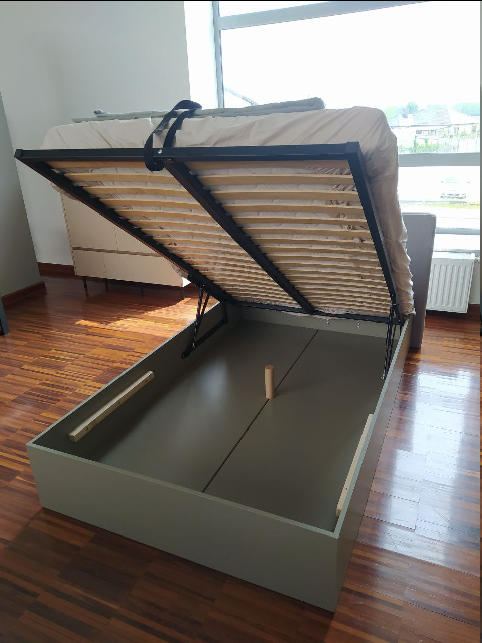 Voodi koos ülestõstetava raami- ja pesukastiga.