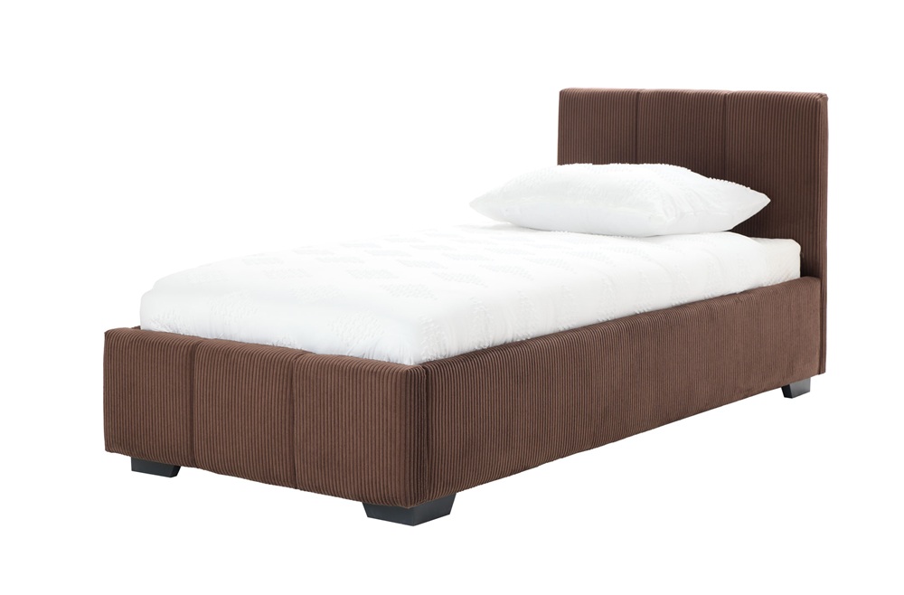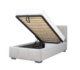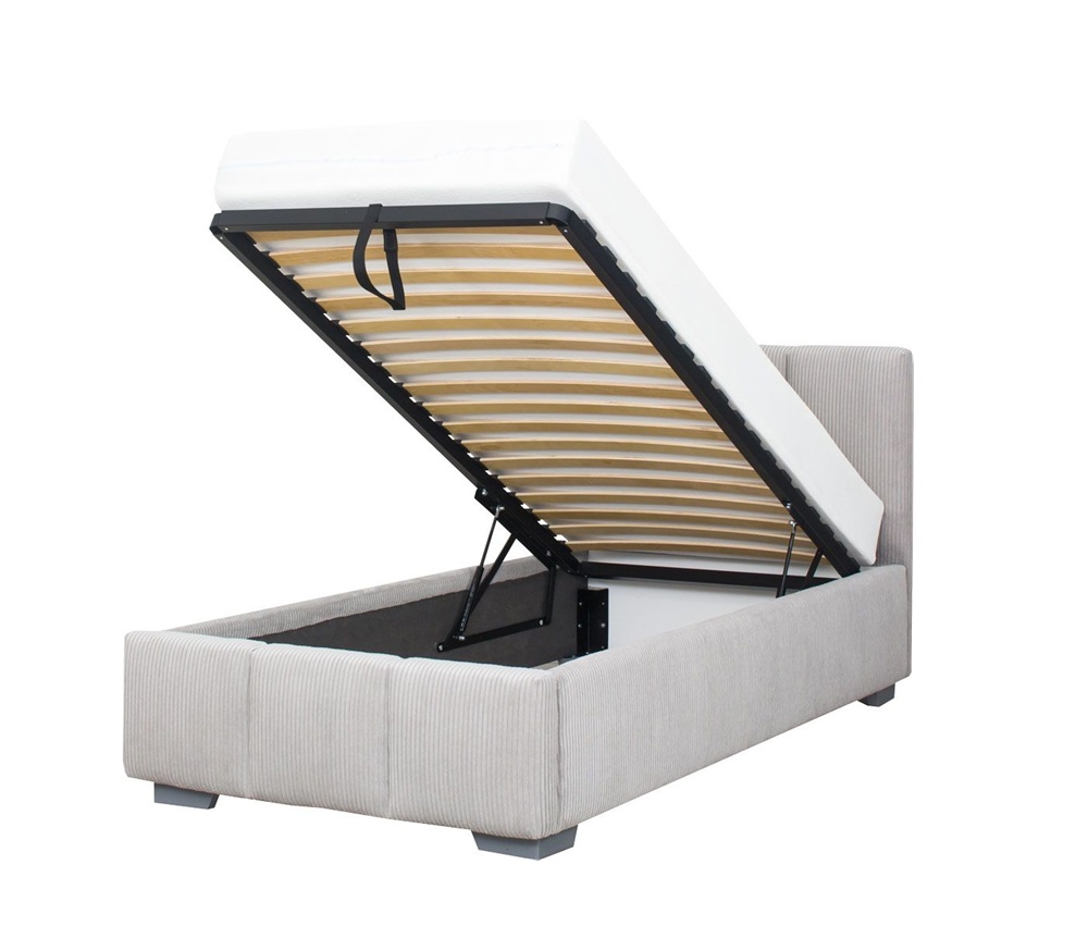 Voodil on ülestõstetav madratsiraam, mille all on mahukas pesukast, karkass on kaetud kangaga.