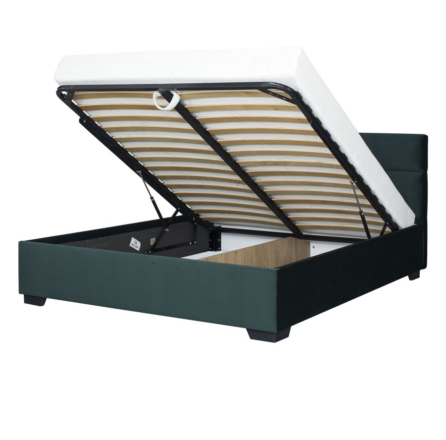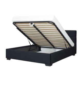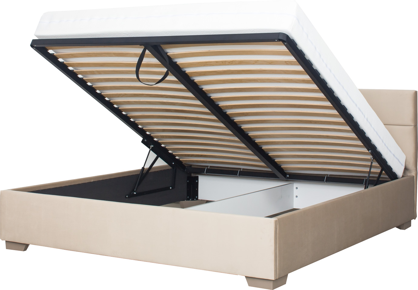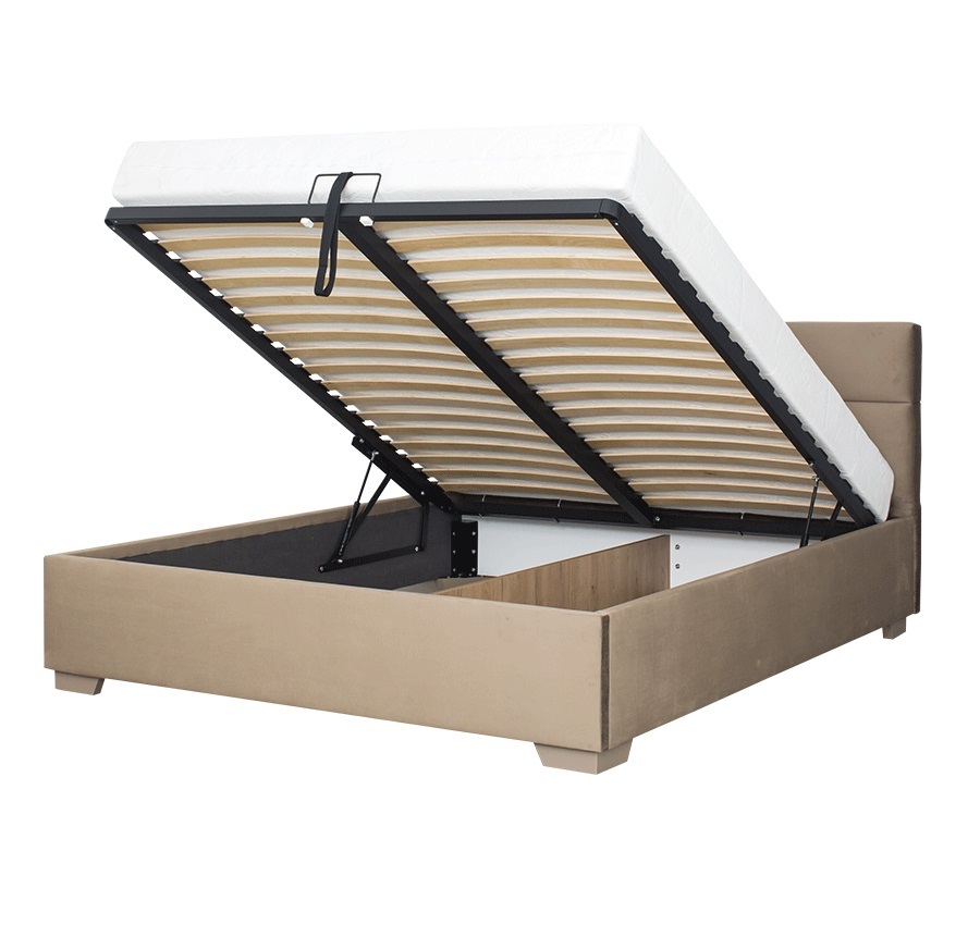 Voodil on ülestõstetav madratsiraam, mille all on mahukas pesukast, karkass on kaetud kangaga.