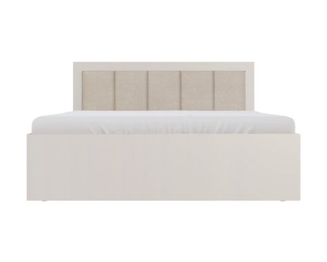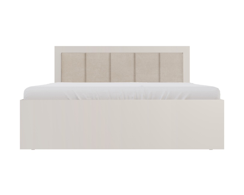 Voodi peatsis on beeži kangaga kaetud pehme polsterdus.
