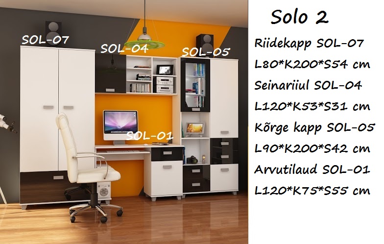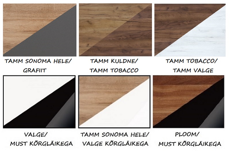 Materjal: kvaliteetne ja vastupidav melamiinkattega laminaat. Värvivalik: tamm sonoma hele/grafiit; tamm kuldne/tamm tobacco; tamm tobacco/tamm valge. Värvivalik kõrgläikega: valge/must kõrgläikega; tamm sonoma hele/valge kõrgläikega; ploom/must kõrgläikega. Lisavalikuna võimalik juurde osta led valgustus. Led-valgustus on saadaval kolmes toonis: soe valge; külm valge ja sinine. Toodetud: Poolas. Toode tarnitakse detailidena. Tarneaeg: 4-8 nädalat. Mõõdud: pildil.