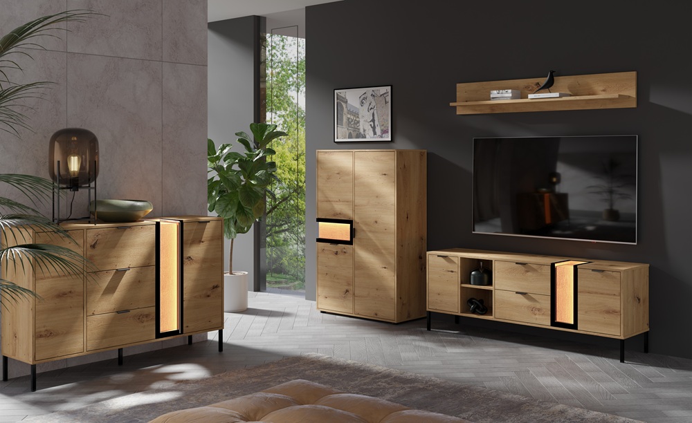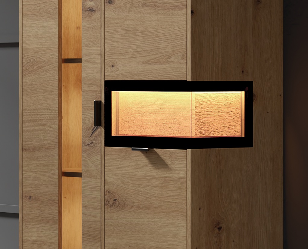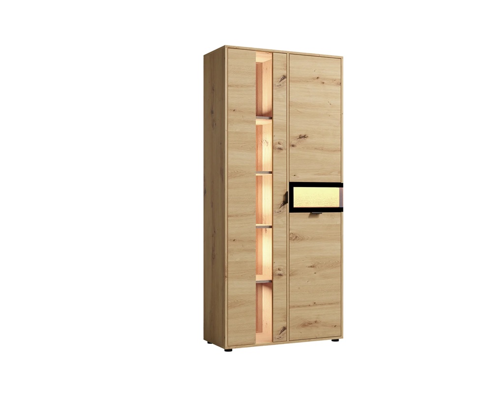 Vitriinkapil on 2 ust. Korpus: lamineeritud mööbliplaat. Esipinnad: lamineeritud mööbliplaat/täispuidust detail/klaas. Komplekti kuulub led valgustus. Musta värvi käepidemed ja jalad. Vaikselt sulguvad uksed. Värv: tamm artisan. Toodetud: Poolas. Toode tarnitakse detailidena. Laius: 89 cm. Sügavus: 37 cm. Kõrgus: 197 cm. Tarneaeg: 4-8 nädalat.