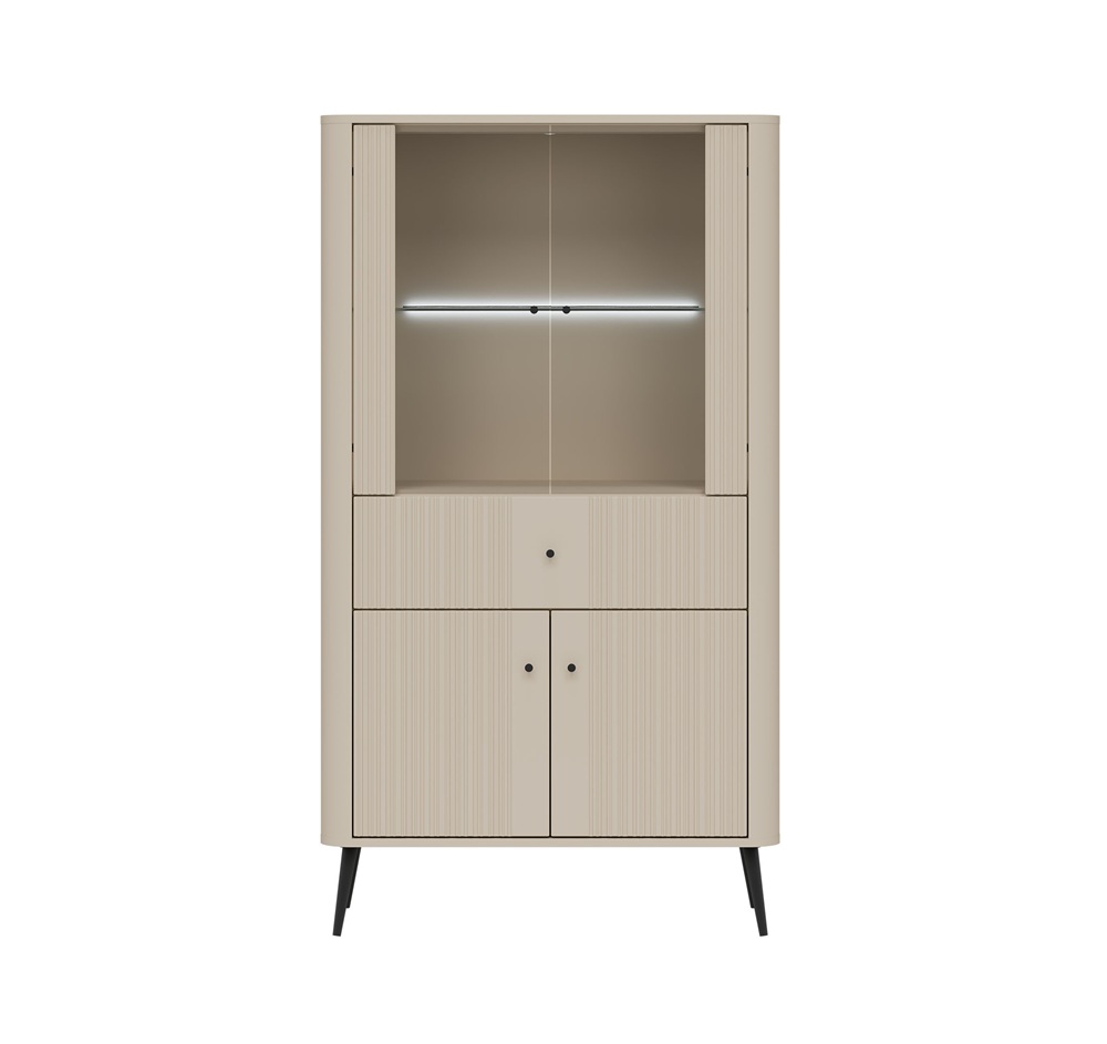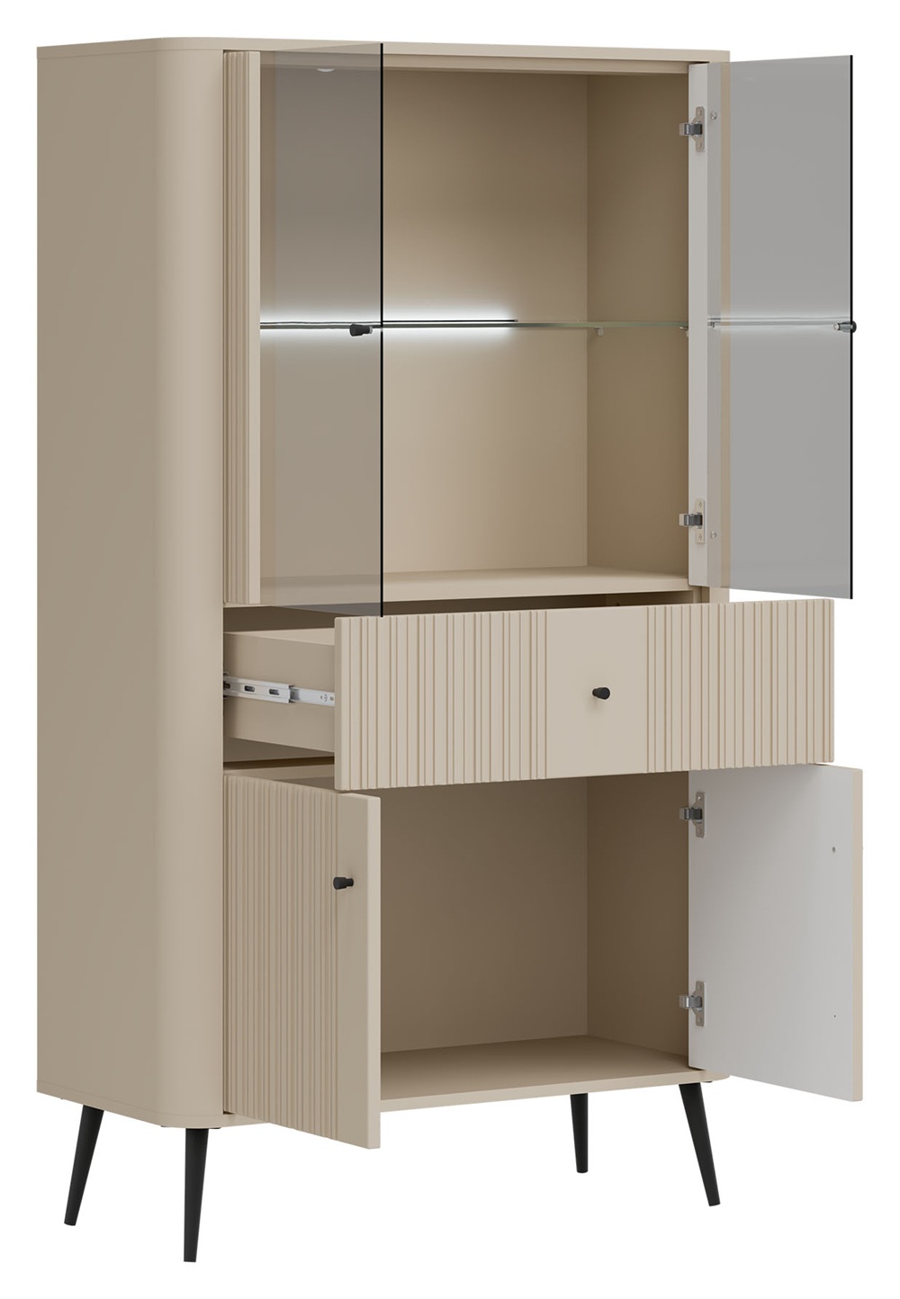 Vitriinkapil on 4 ust ja 1 sahtel. Ülemised uksed on osaliselt tugevast karastatud klaasist. Klaasi värvus: antisol grafiit. Lisavalikuna võimalik juurde osta led valgustus (led 650 mm, külm valge + toiteplokk 12W/kaugjuhtimispult/6-punktiline jaotur/kaablid). Korpus: 16 mm lamineeritud puitlaastplaat/ 32 mm MDF-küljeriba. Pealmine plaat: 16 mm lamineeritud puitlaastplaat. Esipaneelid: 18 mm MDF-plaat. Värv: kašmiir. Kolmes tasapinnas reguleeritavad hinged ᵩ 35 mm. Musta värvi metallist jalad, 18 cm. Mittereguleeritavad. Musta värvi metallist käepidemed. Uksed on vaikselt sulguvad. GTV kuullaagriga liugsahtel, täielikult väljatõmmatav. Toode tarnitakse detailidena. Toodetud: Poolas. Laius: 90 cm. Sügavus: 40 cm. Kõrgus: 160,5 cm. Tarneaeg: laos kohe olemas.