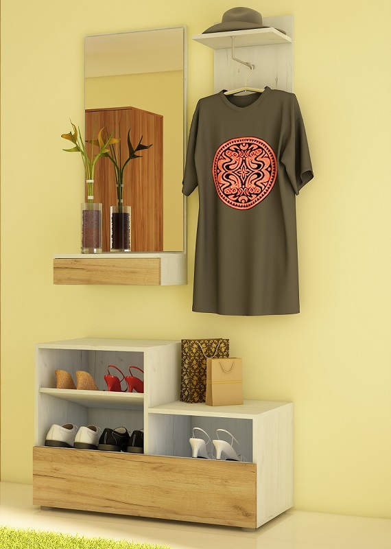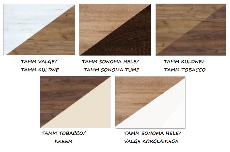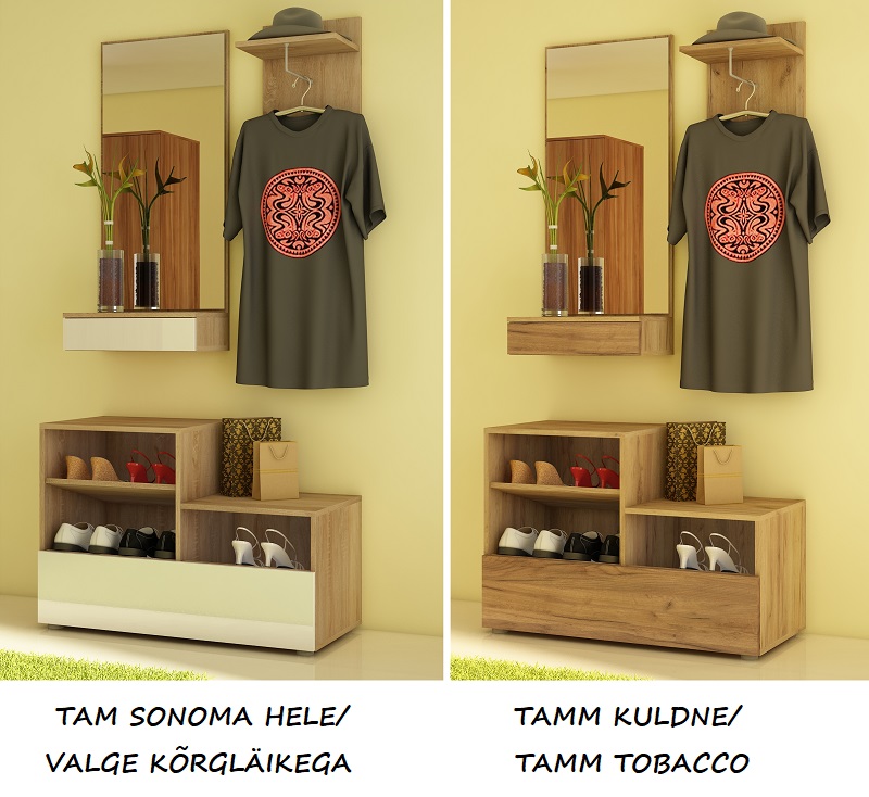 Komplekti kuulub: peegel, riidenagi ja jalanõudekapp. Materjal: kvaliteetne ja vastupidav melamiinkattega laminaat. Värvivalik: tamm valge/tamm kuldne; tamm sonoma hele/tamm sonoma tume; tamm kuldne/tamm tobacco; tamm tobacco/kreem; tamm sonoma hele/valge kõrgläikega. Toode tarnitakse detailidena. Toodetud: Poolas. Kõrgus: 190 cm. Laius: 90 cm. Sügavus: 31 cm. Tarneaeg: 4-8 nädalat.