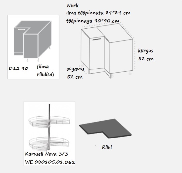 Kapil on 2 ust. Kapis ei ole riiulit. Riiul on võimalik lisana juurde osta. Kappi sobib karusell Nova WE08.0105.01.062. Korpus: 18 mm, lamineeritud mööbliplaat. Korpuse värvivalik: valge; hall; laava-hall. Esipinnad: MDF (matt lakitud pinnaga). Esipindade värvivalikut näeb pildilt. NB! Hinna sisse kuulub käepide Typ U. Teised käepidemed saadaval lisatasu eest. Teise käepideme soovi korral palun kirjutage sobivuse ja hinna täpsustamiseks: See e-posti aadress on spämmirobotite eest kaitstud. Selle nägemiseks peab su veebilehitsejas olema JavaSkript sisse lülitatud.. Tööpind ei kuulu hinna sisse, võimalik juurde tellida SIIT. NB! Võimalus valida kapile jalad 10 cm või 15 cm. 15 cm jalgadele lisandub lisatasu 5.- (5 jalga). Kõrgus ilma jalgadeta: 72 cm. Laius: 84 cm/koos tööpinnaga: 90 cm. Sügavus: 84 cm/koos tööpinnaga: 90 cm. Tarneaeg: 4-12 nädalat. Toodetud: Poolas. Toode tarnitakse detailidena.