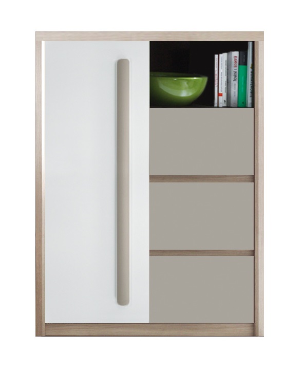 Kummutil on 1 uks ja 3 sahtlit. Materjal: kvaliteetne ja vastupidav melamiinkattega laminaat. Korpus: saar. Esipinnad: valge kõrgläikega (PVC)/hall matt. Toodetud: Poolas. Toode tarnitakse detailidena. Laius: 90 cm. Sügavus: 43 cm. Kõrgus: 117 cm. Tarneaeg: 4-8 nädalat.