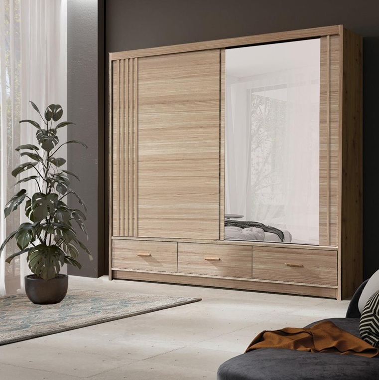 Riidekapil on 2 lükandust ja 3 sahtlit. 1 uks on peegliga.